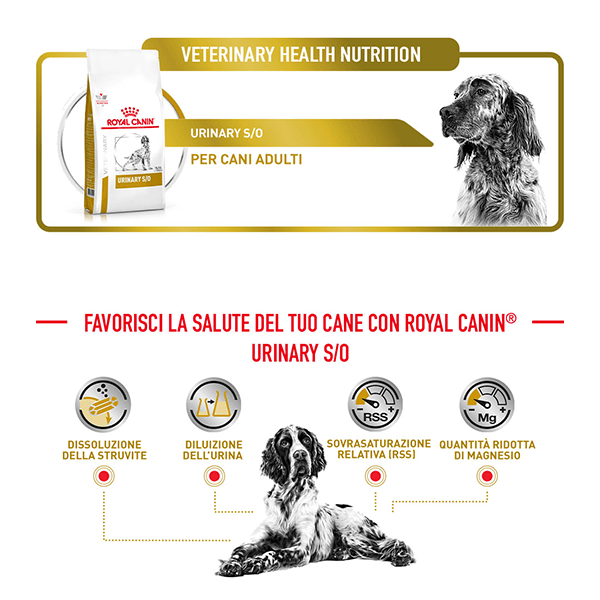 غذای خشک سگ مدل URINARY S/Oرویال کنین یک غذای کامل رژیمی است که فرموله شده برای انحلال سنگ استروویت و کاهش عود بیماری آنها از طریق خواص ادرار اسیدی آن، با سطح پایین منیزیم و میزان محدود پروتئین با کیفیت بالا، می باشد. غذای خشک درمانی سگ یورینری رویال کنین، برای جلوگیری و درمان سنگ کلیه و مثانه تولید و فراوری شده است و انواع سنگ های استراویت و اگزالات را درمان می کند. درد در زمان تخلیه ادرار نشانه ی بیماری سگ است. می توانید زیر نظر دامپزشک رژیم غذایی سگ را تغییر دهید و با درمان بیماری کلیوی، دردهای ناشی از آن را از بین ببرید. غذای سگ یورینری اس/او با افزایش میزان ادرار و رقیق شدن آن همچنین کاهش مواد معدنی موجود در ادرار موجب کاهش تشکیل سنگ های کلیوی و مثانه می شود و به درمان این بیماری کمک می کند. میزان منیزیوم بکار رفته در این غذای سگ بسیار کم است که این امر موجب از بین رفتن سنگ های استروویت می شود.